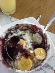 Just a sneek peek at what an Quiosque do Açai looks like! Good, huh? In the left upper corner if you look hard enough, you can see a cup with an orange-yellowish drink. That’s our pineapple juice!